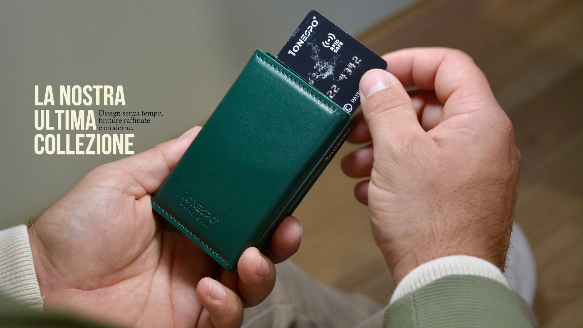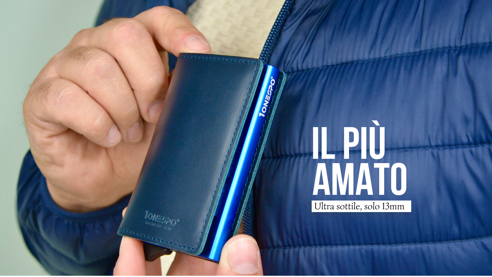 La linea 1ONESPO propone soluzioni per ogni esigenza: dallo slim con clip a scatto al modello con tasca e zip, tutti sottili ma capienti, con accesso rapido alle carte e protezione RFID.